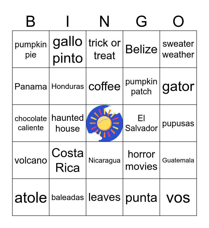 This bingo card has a free space and 24 words: atole, Costa Rica, coffee, punta, sweater weather, pumpkin pie, gallo pinto, trick or treat, El Salvador, pupusas, chocolate caliente, Honduras, horror movies, Guatemala, Panama, baleadas, leaves, Belize, gator, volcano, haunted house, Nicaragua, pumpkin patch and vos.