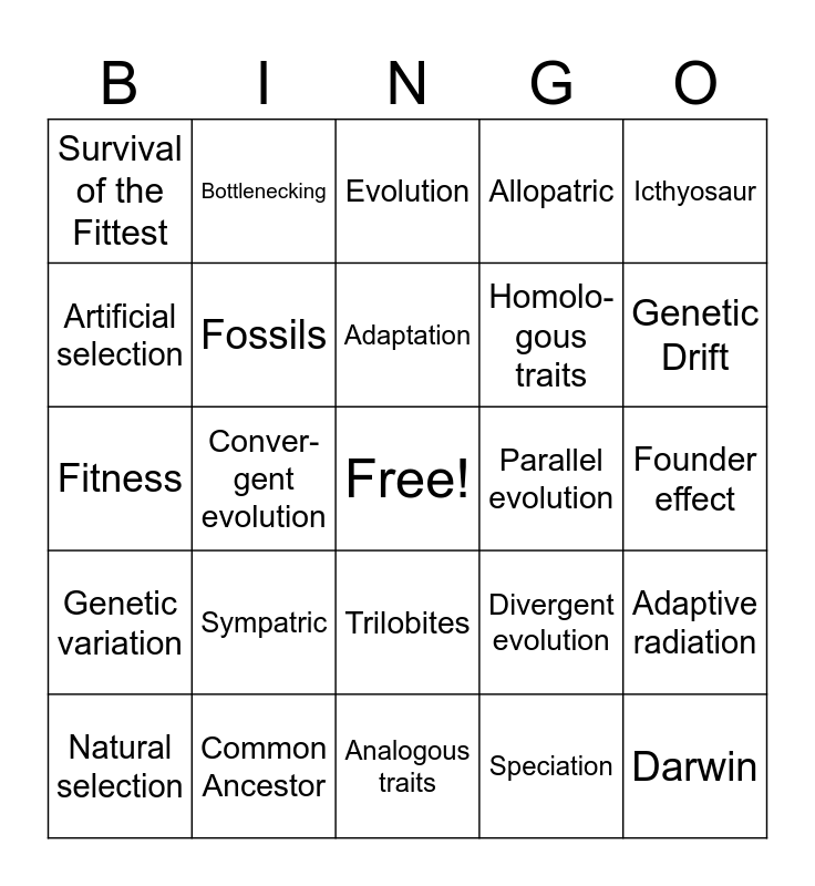 This bingo card has a free space and 27 words: Divergent evolution, Mutation, Homolo-gous traits, Analogous traits, Artificial selection, Evolution, Bottlenecking, Genetic variation, Parallel evolution, Adaptive radiation, Fitness, Allopatric, Natural selection, Common Ancestor, Genetic Drift, Sexual selection, Fossils, Adaptation, Sympatric, Survival of the Fittest, Founder effect, Speciation, Conver-gent evolution, Darwin, Trilobites, Icthyosaur and Niches.