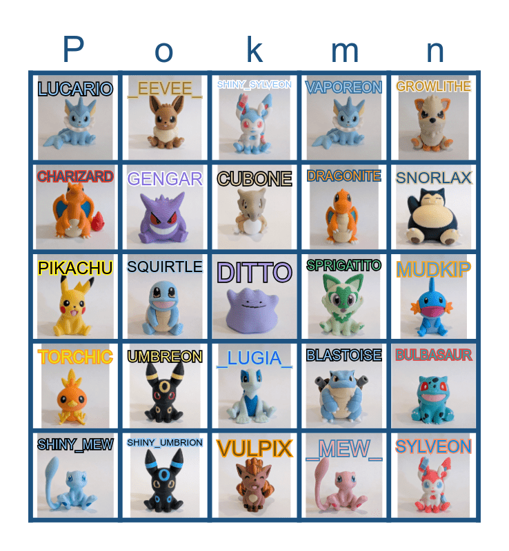 This bingo card has 24 images, a free space and 24 words: UMBREON, SHINY_UMBRION, CUBONE, SHINY_MEW, GROWLITHE, LUCARIO, CHARIZARD, _EEVEE_, SPRIGATITO, _LUGIA_, DRAGONITE, PIKACHU, BLASTOISE, BULBASAUR, GENGAR, _MEW_, MUDKIP, SHINY_SYLVEON, SNORLAX, SQUIRTLE, SYLVEON, TORCHIC, VAPOREON and VULPIX.