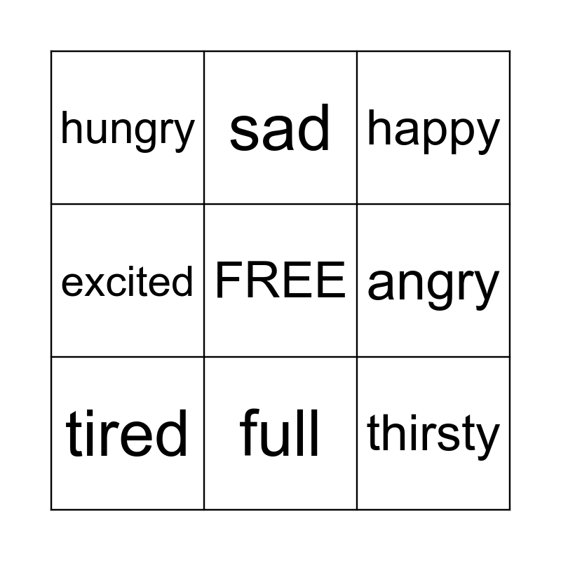 This bingo card has a free space and 8 words: angry, happy, sad, tired, hungry, thirsty, excited and full.