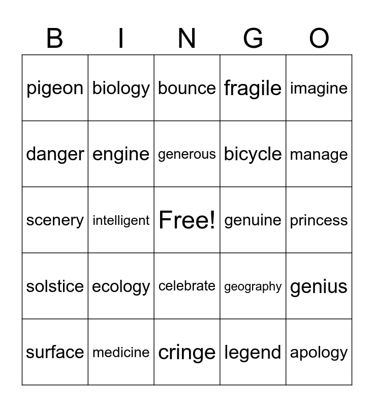 This bingo card has a free space and 50 words: agent, apology, budget, cringe, ecology, allergy, biology, damage, danger, emergency, engine, fragile, genius, geography, gigantic, engineer, generous, genuine, gesture, imagine, intelligent, legend, pigeon, bicycle, bracelet, knowledge, manage, religion, bounce, celebrate, cellophane, centipede, certificate, cylinder, medicine, cemetery, century, citizen, grocery, princess, romance, science, sentence, silence, surface, scenery, scissors, service, solstice and wince.