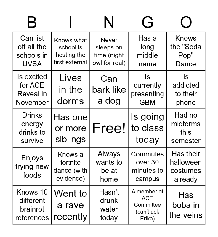 This bingo card has a free space and 24 words: Knows 10 different brainrot references, Knows a fortnite dance (with evidence), Can bark like a dog, A member of ACE Committee (can't ask Erika), Knows the "Soda Pop" Dance, Can list off all the schools in UVSA, Knows what school is hosting the first external, Never sleeps on time (night owl for real), Is going to class today, Had no midterms this semester, Drinks energy drinks to survive, Lives in the dorms, Commutes over 30 minutes to campus, Has their halloween costumes already, Is excited for ACE Reveal in November, Went to a rave recently, Hasn't drunk water today, Has a long middle name, Is addicted to their phone, Enjoys trying new foods, Has one or more siblings, Always wants to be at home, Is currently presenting GBM and Has boba in the veins.