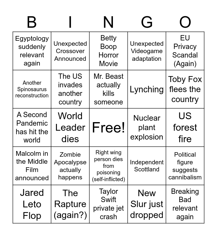 This bingo card has a free space and 24 words: Zombie Apocalypse actually happens, The Rapture (again?), Mr. Beast actually kills someone, Jared Leto Flop, EU Privacy Scandal (Again), Egyptology suddenly relevant again, Another Spinosaurus reconstruction, Unexpected Crossover Announced, Nuclear plant explosion, Right wing person dies from poisoning (self-inflicted), Lynching, A Second Pandemic has hit the world, Independent Scottland, Political figure suggests cannibalism, The US invades another country, New Slur just dropped, US forest fire, Betty Boop Horror Movie, Toby Fox flees the country, World Leader dies, Breaking Bad relevant again, Malcolm in the Middle Film announced, Unexpected Videogame adaptation and Taylor Swift private jet crash.