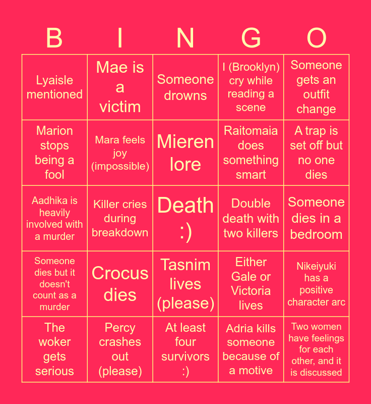 This bingo card has a free space and 24 words: Crocus dies, Percy crashes out (please), Mieren lore, The woker gets serious, Someone gets an outfit change, Lyaisle mentioned, Marion stops being a fool, Mae is a victim, Double death with two killers, Tasnim lives (please), Raitomaia does something smart, Aadhika is heavily involved with a murder, Either Gale or Victoria lives, Nikeiyuki has a positive character arc, Mara feels joy (impossible), Adria kills someone because of a motive, Someone dies in a bedroom, Someone drowns, A trap is set off but no one dies, Killer cries during breakdown, Two women have feelings for each other, and it is discussed, Someone dies but it doesn't count as a murder, I (Brooklyn) cry while reading a scene and At least four survivors :).