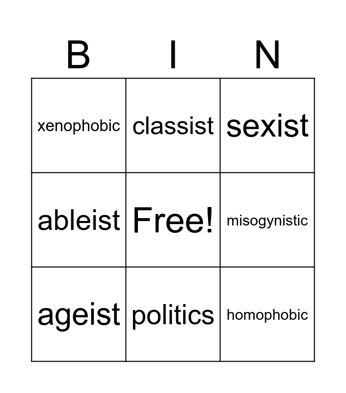 This bingo card has a free space and 8 words: misogynistic, sexist, classist, ageist, xenophobic, homophobic, ableist and politics.