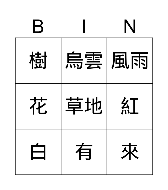 This bingo card has a free space and 8 words: 紅, 風雨, 烏雲, 白, 樹, 來, 花 and 有.