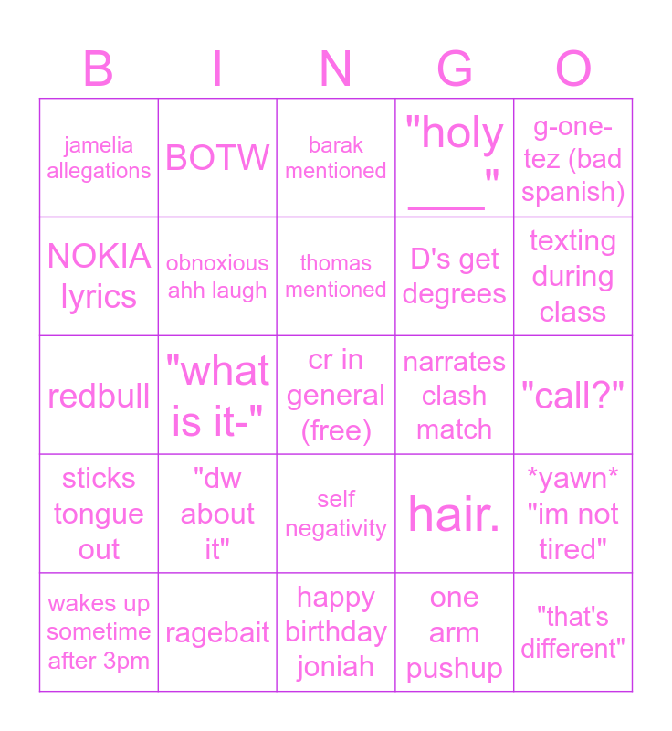This bingo card has a free space and 24 words: "dw about it", ragebait, thomas mentioned, wakes up sometime after 3pm, g-one-tez (bad spanish), jamelia allegations, NOKIA lyrics, BOTW, narrates clash match, self negativity, D's get degrees, redbull, hair., *yawn* "im not tired", obnoxious ahh laugh, one arm pushup, "call?", barak mentioned, texting during class, "what is it-", "that's different", sticks tongue out, "holy ___" and happy birthday joniah.