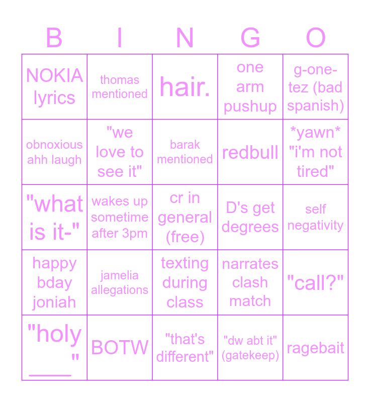 This bingo card has a free space and 24 words: jamelia allegations, BOTW, barak mentioned, "holy ___", g-one-tez (bad spanish), NOKIA lyrics, obnoxious ahh laugh, thomas mentioned, D's get degrees, texting during class, redbull, "what is it-", narrates clash match, "call?", "we love to see it", "dw abt it" (gatekeep), self negativity, hair., *yawn* "i'm not tired", wakes up sometime after 3pm, ragebait, happy bday joniah, one arm pushup and "that's different".
