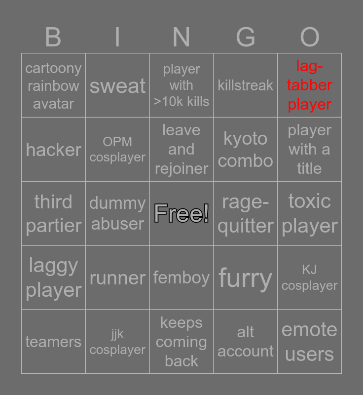 This bingo card has a free space and 24 words: runner, jjk cosplayer, leave and rejoiner, teamers, lag-tabber player, cartoony rainbow avatar, hacker, sweat, rage-quitter, femboy, kyoto combo, third partier, furry, KJ cosplayer, OPM cosplayer, alt account, toxic player, player with >10k kills, player with a title, dummy abuser, emote users, laggy player, killstreak and keeps coming back.