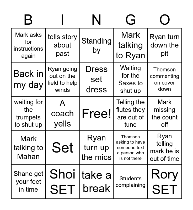 This bingo card has a free space and 24 words: Set, Shoi SET, Dress set dress, Shane get your feet in time, Ryan turn down the pit, Mark asks for instructions again, Back in my day, tells story about past, Telling the flutes they are out of tune, Ryan turn up the mics, Waiting for the Saxes to shut up, waiting for the trumpets to shut up, Thomson asking to have someone text a person who is not there, Ryan telling mark he is out of time, Ryan going out on the field to help winds, Students complaining, Mark missing the count off, Standing by, Thomson commenting on cover down, A coach yells, Rory SET, Mark talking to Mahan, Mark talking to Ryan and take a break.