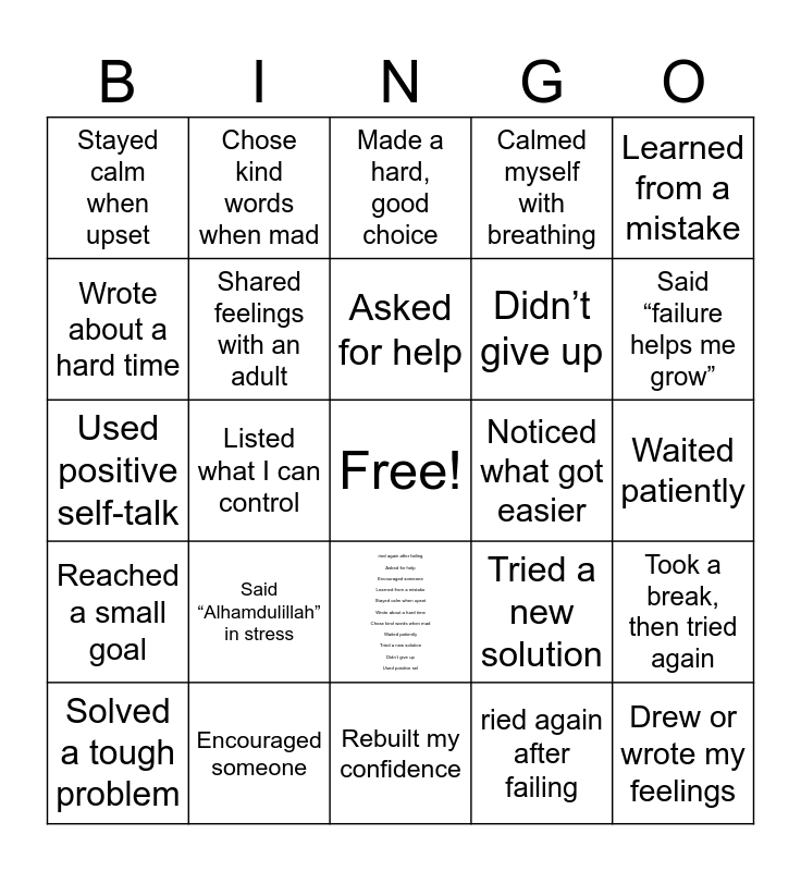 This bingo card has a free space and 26 words: ried again after failing Asked for help Encouraged someone Learned from a mistake Stayed calm when upset Wrote about a hard time Chose kind words when mad Waited patiently Tried a new solution Didn’t give up Used positive sel, ried again after failing, Asked for help, Encouraged someone, Learned from a mistake, Stayed calm when upset, Wrote about a hard time, Chose kind words when mad, Waited patiently, Tried a new solution, Didn’t give up, Used positive self-talk, Took a break, then tried again, Solved a tough problem, Listed what I can control, Helped someone stay strong, Calmed myself with breathing, Reached a small goal, Made a hard, good choice, Drew or wrote my feelings, Said “failure helps me grow”, Rebuilt my confidence, Noticed what got easier, Said “Alhamdulillah” in stress, Shared feelings with an adult and Stayed kind to myself.