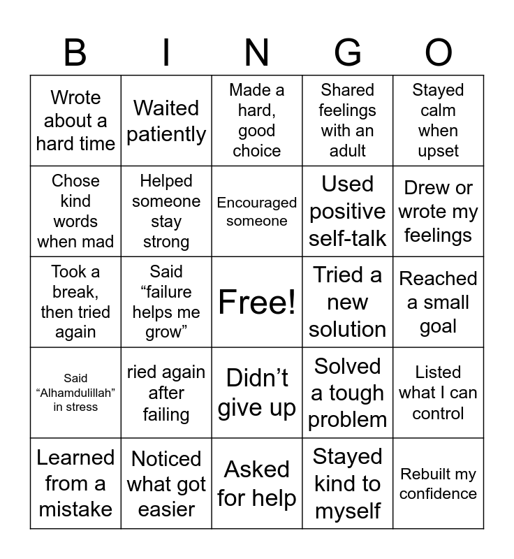 This bingo card has a free space and 25 words: ried again after failing, Asked for help, Encouraged someone, Learned from a mistake, Stayed calm when upset, Wrote about a hard time, Chose kind words when mad, Waited patiently, Tried a new solution, Didn’t give up, Used positive self-talk, Took a break, then tried again, Solved a tough problem, Listed what I can control, Helped someone stay strong, Calmed myself with breathing, Reached a small goal, Made a hard, good choice, Drew or wrote my feelings, Said “failure helps me grow”, Rebuilt my confidence, Noticed what got easier, Said “Alhamdulillah” in stress, Shared feelings with an adult and Stayed kind to myself.