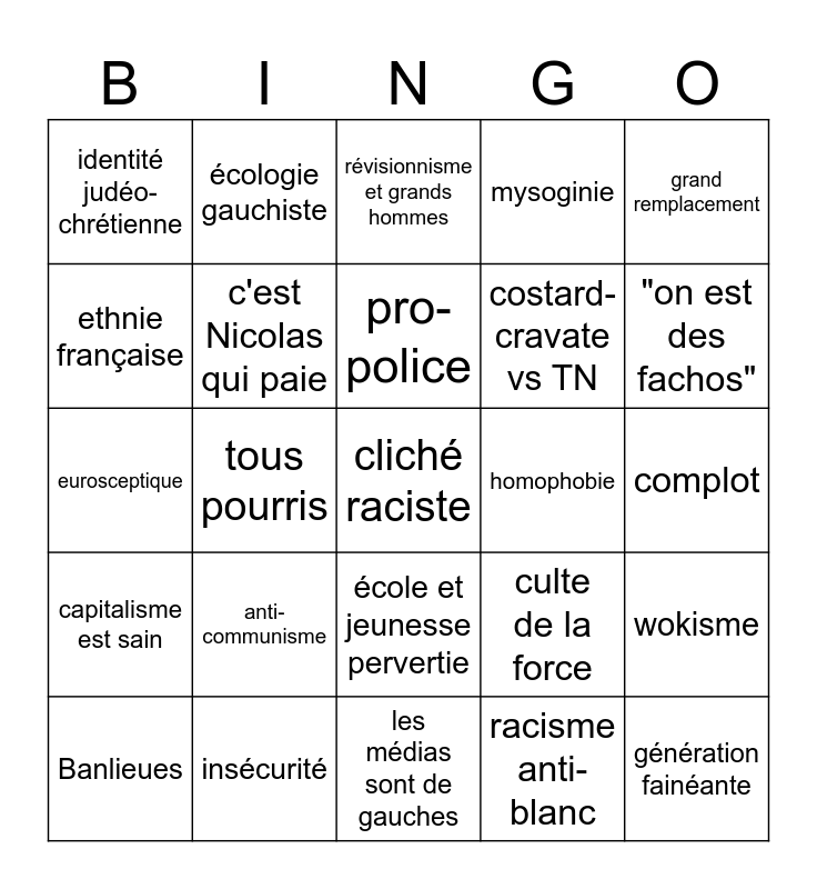 This bingo card has a free space and 24 words: anti-communisme, insécurité, pro-police, Banlieues, grand remplacement, identité judéo-chrétienne, ethnie française, écologie gauchiste, homophobie, école et jeunesse pervertie, costard-cravate vs TN, eurosceptique, culte de la force, wokisme, c'est Nicolas qui paie, racisme anti-blanc, complot, révisionnisme et grands hommes, "on est des fachos", tous pourris, génération fainéante, capitalisme est sain, mysoginie and les médias sont de gauches.