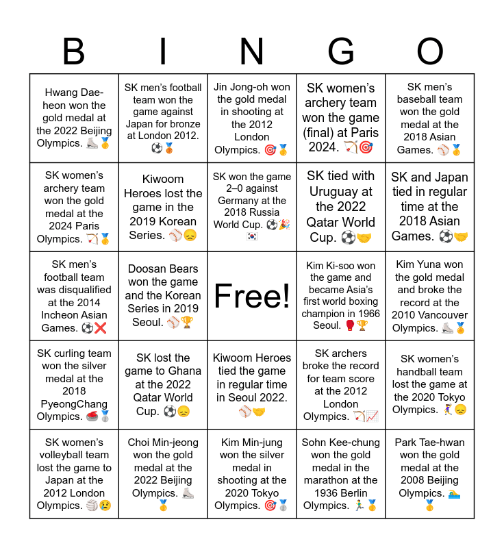 This bingo card has a free space and 30 words: Choi Min-jeong won the gold medal at the 2022 Beijing Olympics. โธ๏ธ๐ฅ, Choi Min-jeong was disqualified in a short-track race at PyeongChang 2018. โธ๏ธโ, Doosan Bears won the game and the Korean Series in 2019 Seoul. โพ๏ธ๐, Doosan Bears won the game against Kiwoom in the 2019 Korean Series. โพ๏ธ๐, Hwang Dae-heon won the gold medal at the 2022 Beijing Olympics. โธ๏ธ๐ฅ, Jin Jong-oh won the gold medal in shooting at the 2012 London Olympics. ๐ฏ๐ฅ, Kiwoom Heroes lost the game in the 2019 Korean Series. โพ๏ธ๐, Kiwoom Heroes tied the game in regular time in Seoul 2022. โพ๏ธ๐ค, Kim Ki-soo won the game and became Asiaโs first world boxing champion in 1966 Seoul. ๐ฅ๐, Kim Min-jung won the silver medal in shooting at the 2020 Tokyo Olympics. ๐ฏ๐ฅ, Kim Yuna won the gold medal and broke the record at the 2010 Vancouver Olympics. โธ๏ธ๐ , Park Tae-hwan won the gold medal at the 2008 Beijing Olympics. ๐โโ๏ธ๐ฅ, Sohn Kee-chung won the gold medal in the marathon at the 1936 Berlin Olympics. ๐โโ๏ธ๐ฅ, Son Heung-min won the gold medal at the 2018 Asian Games in Jakarta. โฝ๏ธ๐ฅ, SK and Japan tied in regular time at the 2018 Asian Games. โฝ๏ธ๐ค, SK archery team broke the record for accuracy at the 2020 Tokyo Olympics. ๐น๐, SK archers broke the record for team score at the 2012 London Olympics. ๐น๐, SK curling team won the silver medal at the 2018 PyeongChang Olympics. ๐ฅ๐ฅ, SK lost the game to Ghana at the 2022 Qatar World Cup. โฝ๏ธ๐, SK menโs baseball team won the gold medal at the 2018 Asian Games. โพ๏ธ๐ฅ, SK menโs football team was disqualified at the 2014 Incheon Asian Games. โฝ๏ธโ, SK menโs football team won the bronze medal at the 2012 London Olympics. โฝ๏ธ๐ฅ, SK menโs football team won the game against Japan for bronze at London 2012. โฝ๏ธ๐ฅ, SK tied with Uruguay at the 2022 Qatar World Cup. โฝ๏ธ๐ค, SK womenโs archery team won the gold medal at the 2024 Paris Olympics. ๐น๐ฅ, SK womenโs archery team won the game (final) at Paris 2024. ๐น๐ฏ, SK womenโs handball team lost the game at the 2020 Tokyo Olympics. ๐คพโโ๏ธ๐, SK womenโs volleyball team lost the game to Japan at the 2012 London Olympics. ๐๐ข, SK won the game 2โ0 against Germany at the 2018 Russia World Cup. โฝ๏ธ๐๐ฐ๐ท and Yeo Seo-jeong won the bronze medal in vault at the 2020 Tokyo Olympics. ๐คธโโ๏ธ๐ฅ.