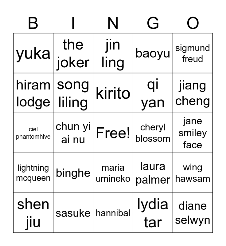 This bingo card has a free space and 24 words: binghe, sasuke, kirito, shen jiu, sigmund freud, yuka, hiram lodge, the joker, cheryl blossom, maria umineko, qi yan, ciel phantomhive, laura palmer, wing hawsam, song liling, lydia tar, jane smiley face, jin ling, jiang cheng, chun yi ai nu, diane selwyn, lightning mcqueen, baoyu and hannibal.