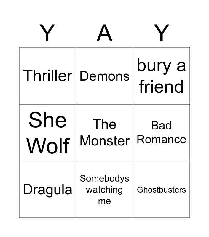 This bingo card has a free space and 18 words: Soda pop, Disturbia, bury a friend, Thriller, Cannibal, She Wolf, Dark Horse, Demons, Somebodys watching me, Sweet but Psycho, Black Magic, Ghostbusters, Spooky, Scary Skeletons, Bad Romance, Dragula, Zombie, This Is Halloween and Heads Will Roll.