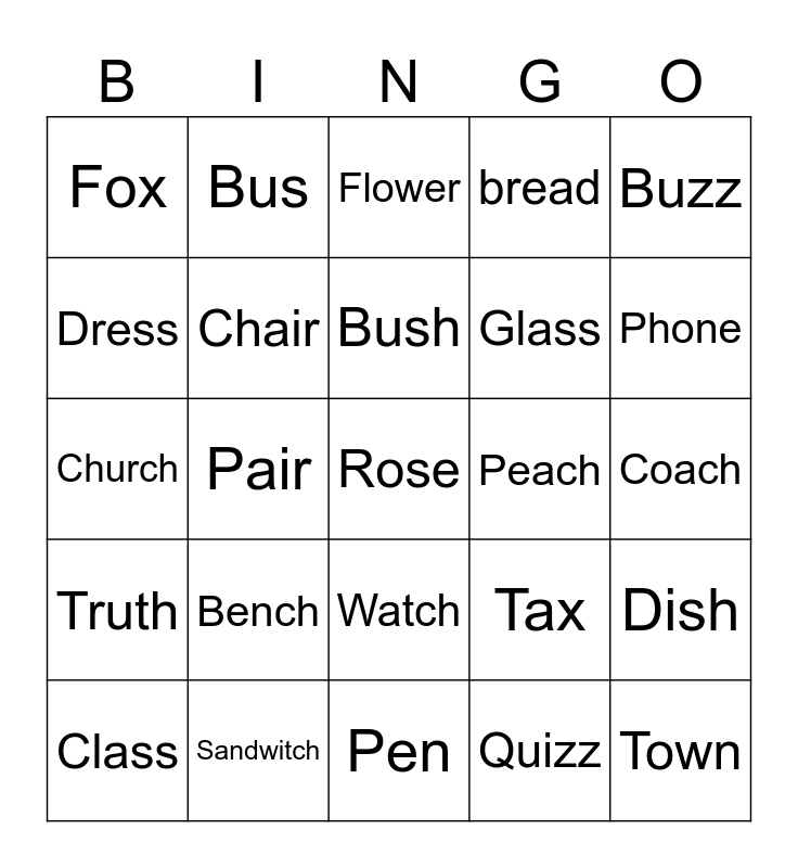 This bingo card has a free space and 24 words: Bench, Sandwitch, Bush, Class, Buzz, Fox, Dress, Bus, Peach, Watch, Glass, Church, Tax, Dish, Chair, Quizz, Coach, Flower, Phone, Pair, Town, Truth, bread and Pen.
