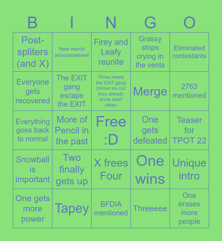 This bingo card has a free space and 24 words: Two finally gets up, Tapey, Three meets the EXIT gang (minus six cuz they already know each other), One gets more power, Eliminated contestants, Post-spliters (and X), Everyone gets recovered, New merch announcement, One gets defeated, X frees Four, Merge, Everything goes back to normal, One wins, Unique intro, The EXIT gang escape the EXIT, Threeeee, Teaser for TPOT 22, Firey and Leafy reunite, 2763 mentioned, More of Pencil in the past, One erases more people, Snowball is important, Grassy stops crying in the vents and BFDIA mentioned.