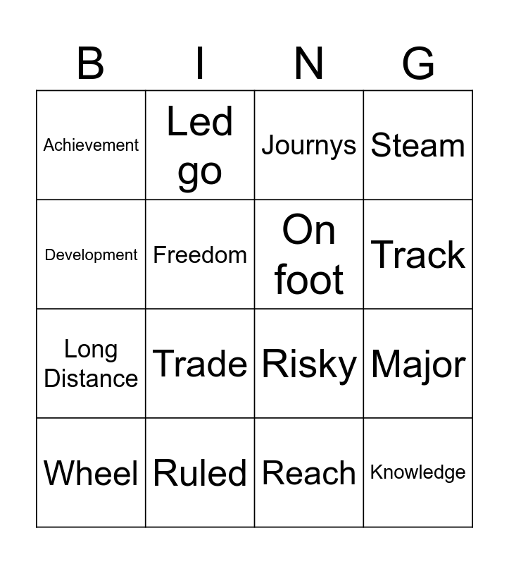 This bingo card has 16 words: Ruled, Major, Journys, Achievement, Long Distance, Led go, Risky, Reach, Development, Freedom, Wheel, Steam, Trade, Track, On foot and Knowledge.