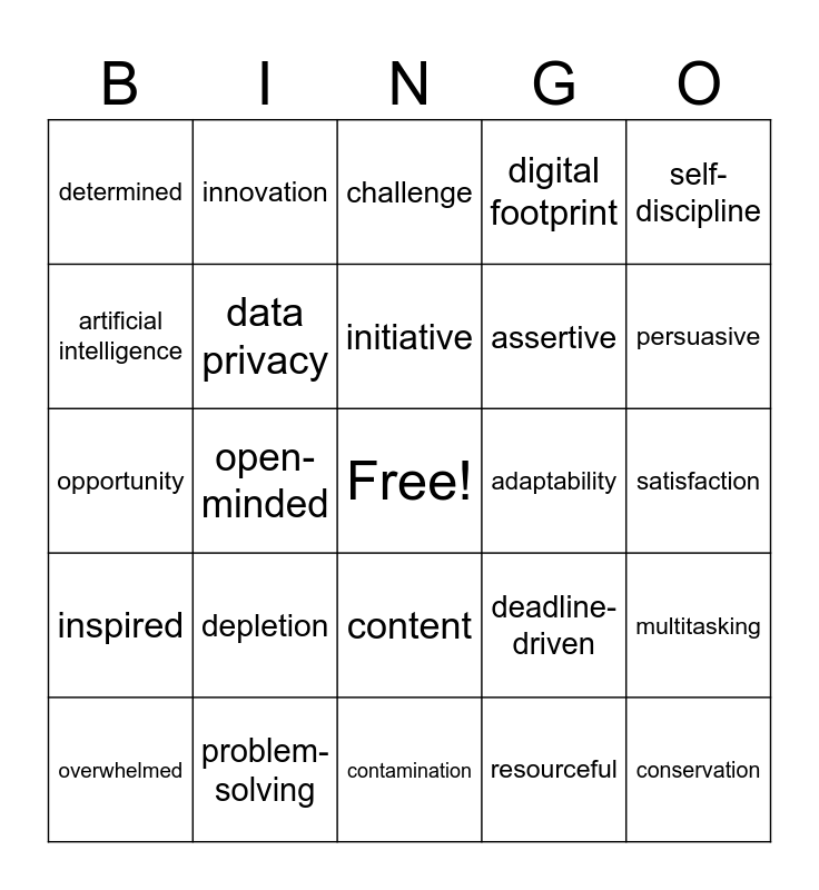 This bingo card has a free space and 49 words: sustainable, conservation, biodiversity, contamination, depletion, renewable resources, innovation, automation, artificial intelligence, efficiency, data privacy, digital footprint, multitasking, deadline-driven, productivity, collaboration, initiative, adaptability, resilience, self-discipline, open-minded, resourceful, determined, assertive, empathetic, persuasive, overwhelmed, frustrated, content, inspired, accomplished, negotiation, leadership, decision-making, problem-solving, critical thinking, perspective, motivation, satisfaction, fulfillment, reputation, impact, influence, achievement, opportunity, challenge, breakthrough, balance and well-being.