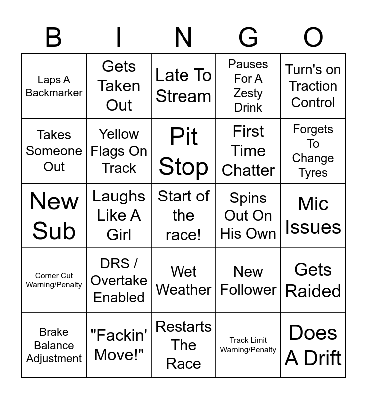 This bingo card has a free space and 24 words: DRS / Overtake Enabled, "Fackin' Move!", Pit Stop, Brake Balance Adjustment, Turn's on Traction Control, Laps A Backmarker, Takes Someone Out, Gets Taken Out, Spins Out On His Own, Wet Weather, First Time Chatter, New Sub, New Follower, Gets Raided, Yellow Flags On Track, Track Limit Warning/Penalty, Mic Issues, Late To Stream, Forgets To Change Tyres, Laughs Like A Girl, Does A Drift, Corner Cut Warning/Penalty, Pauses For A Zesty Drink and Restarts The Race.
