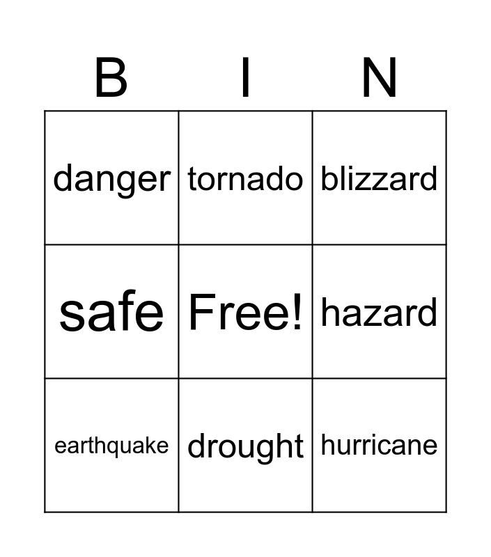 This bingo card has a free space and 11 words: tsunami, drought, hurricane, earthquake, tornado, blizzard, hazard, flood, safe, danger and snow.