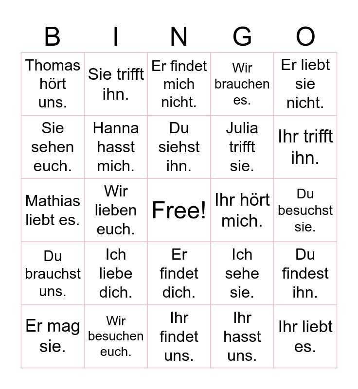 This bingo card has a free space and 24 words: Ich liebe dich., Wir besuchen euch., Du siehst ihn., Er mag sie., Er liebt sie nicht., Thomas hört uns., Sie sehen euch., Sie trifft ihn., Ihr hört mich., Er findet dich., Julia trifft sie., Mathias liebt es., Ich sehe sie., Du findest ihn., Hanna hasst mich., Ihr hasst uns., Du besuchst sie., Er findet mich nicht., Ihr trifft ihn., Wir lieben euch., Ihr liebt es., Du brauchst uns., Wir brauchen es. and Ihr findet uns..