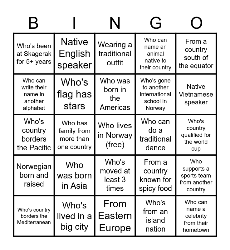 This bingo card has a free space and 34 words: Norwegian born abroad, Who's from an island nation, Native Norwegian speaker, Who just moved to Norway this year, Norwegian born and raised, Who's flag has stars, From a country south of the equator, Who's country borders the Mediterranean, Native English speaker, European born and raised, Who was born in the Americas, Wearing a traditional outfit, Who brought a cultural dish, Who's flag has red, white, and blue, Who can do a traditional dance, Native Vietnamese speaker, Who's lived in a big city, Who's country borders the Pacific, Who was born in Asia, From a country known for spicy food, Who's moved at least 3 times, Who was born in another country, Who's been at Skagerak for 5+ years, Who's country qualified for the world cup, From Eastern Europe, Who can name a celebrity from their hometown, Who can name an animal native to their country, From the African continent, Who's gone to another international school in Norway, Who can write their name in another alphabet, Who can sing a traditional song, Who has family from more than one country, Who supports a sports team from another country and Who's been to a concert in another country.