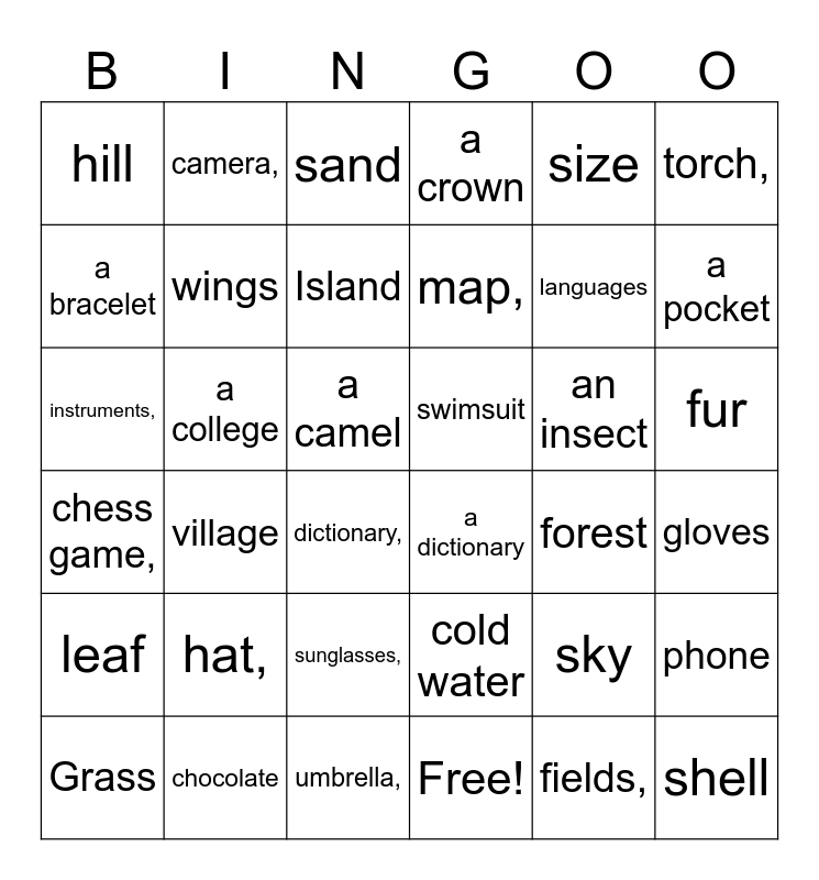This bingo card has 41 words: Free!, languages, sunglasses,, a bracelet, a dictionary, fur, wings, snail, size, swimsuit, a pocket, a crown, instruments,, a camel, a college, an insect, Grass, hill, fields,, sand, village, leaf, forest, Island, shell, sky, gloves, sweater, map,, hat,, T-shirt,, camera,, dictionary,, chocolate, chess game,, torch,, sunglasses,, phone, umbrella,, cold water and blanket.