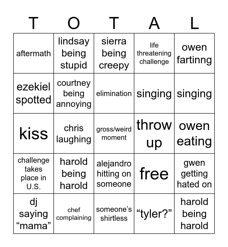 This bingo card has 25 words: harold being harold, someone’s shirtless, elimination, dj saying “mama”, owen fartinng, aftermath, ezekiel spotted, lindsay being stupid, throw up, alejandro hitting on someone, singing, kiss, free, gwen getting hated on, courtney being annoying, harold being harold, owen eating, sierra being creepy, singing, chris laughing, gross/weird moment, chef complaining, challenge takes place in U.S., life threatening challenge and “tyler?”.