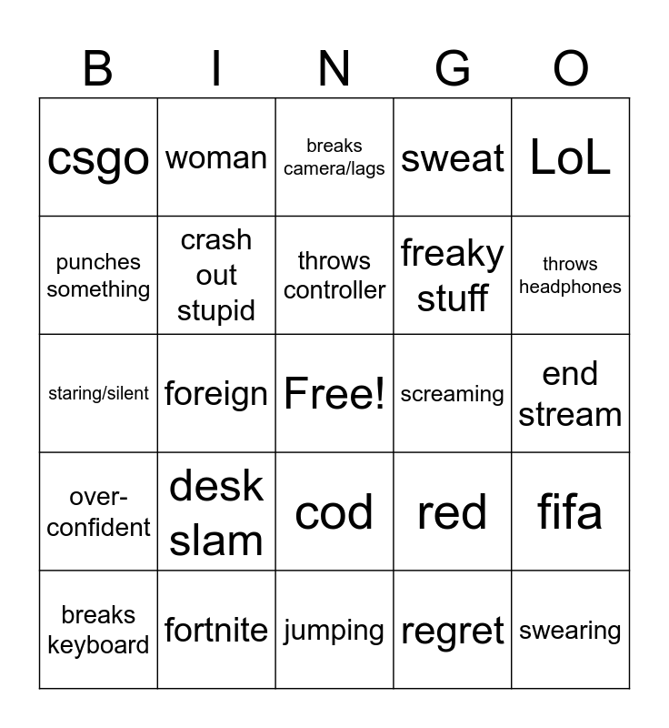 This bingo card has a free space and 24 words: desk slam, fortnite, throws controller, breaks keyboard, LoL, csgo, punches something, woman, screaming, cod, freaky stuff, staring/silent, red, fifa, crash out stupid, regret, end stream, breaks camera/lags, throws headphones, foreign, swearing, over-confident, sweat and jumping.