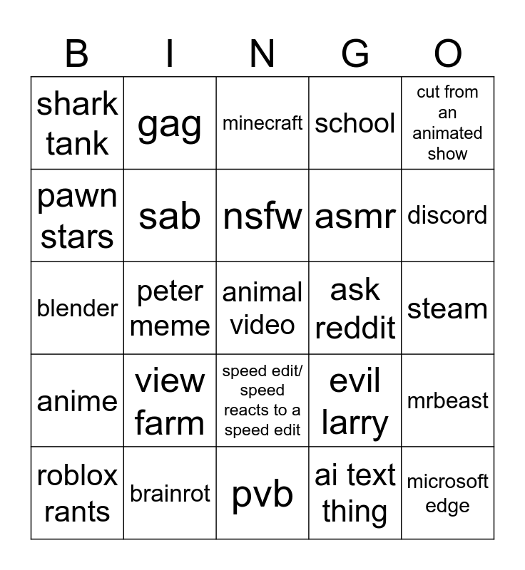 This bingo card has a free space and 24 words: view farm, brainrot, nsfw, roblox rants, cut from an animated show, shark tank, pawn stars, gag, ask reddit, speed edit/ speed reacts to a speed edit, asmr, blender, evil larry, mrbeast, sab, ai text thing, steam, minecraft, discord, peter meme, microsoft edge, anime, school and pvb.