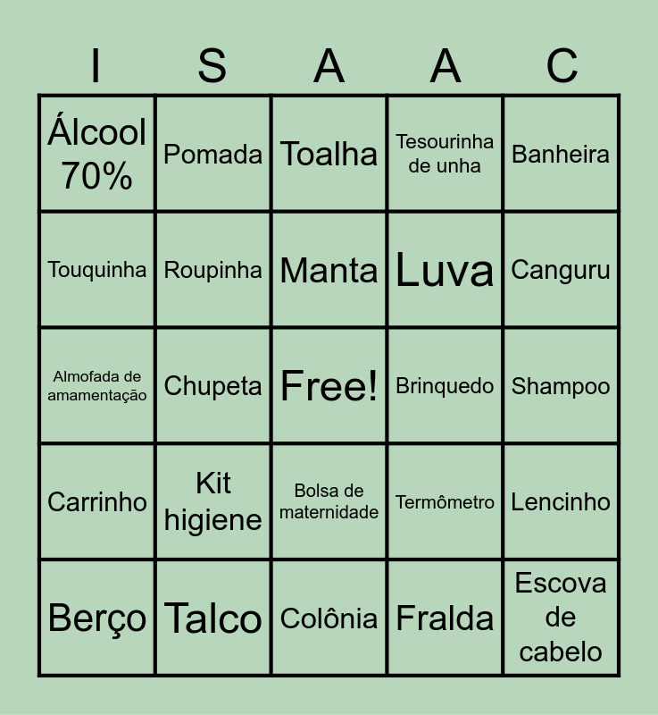 This bingo card has a free space and 32 words: Fralda, Mamadeira, Chupeta, Body, Carrinho, Roupinha, Banheira, Lencinho, Pomada, Meias, Manta, Toalha, Lençol, Babador, Brinquedo, Chocalho, Berço, Almofada de amamentação, Bolsa de maternidade, Kit higiene, Termômetro, Sabonete, Shampoo, Talco, Escova de cabelo, Tesourinha de unha, Luva, Touquinha, Álcool 70%, Colônia, Paninho de boca and Canguru.
