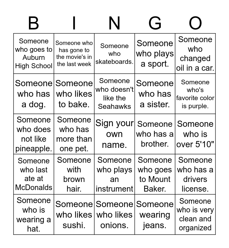 This bingo card has a free space and 24 words: Someone with brown hair., Someone who likes sushi., Someone who doesn't like the Seahawks, Someone who is wearing a hat., Someone who changed oil in a car., Someone who goes to Auburn High School, Someone who has a dog., Someone who has gone to the movie's in the last week, Someone who has a brother., Someone who plays an instrument, Someone who has a sister., Someone who does not like pineapple., Someone who goes to Mount Baker., Someone who has a drivers license., Someone who likes to bake., Someone wearing jeans., Someone who is over 5'10", Someone who skateboards., Someone who's favorite color is purple., Someone who has more than one pet., Someone who is very clean and organized, Someone who last ate at McDonalds, Someone who plays a sport. and Someone who likes onions..