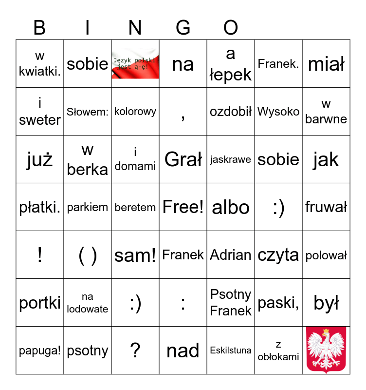 This bingo card has 2 images, a free space and 46 words: Psotny Franek, Wysoko, nad, parkiem, i domami, fruwał, sobie, psotny, Franek., Franek, miał, na, sobie, jaskrawe, portki, :), i sweter, w barwne, paski,, a łepek, ozdobił, beretem, w kwiatki., Słowem:, był, kolorowy, jak, papuga!, Grał, w berka, z obłokami, albo, polował, na lodowate, płatki., Adrian, czyta, już, sam!, :), !, ?, ,, :, ( ) and Eskilstuna.
