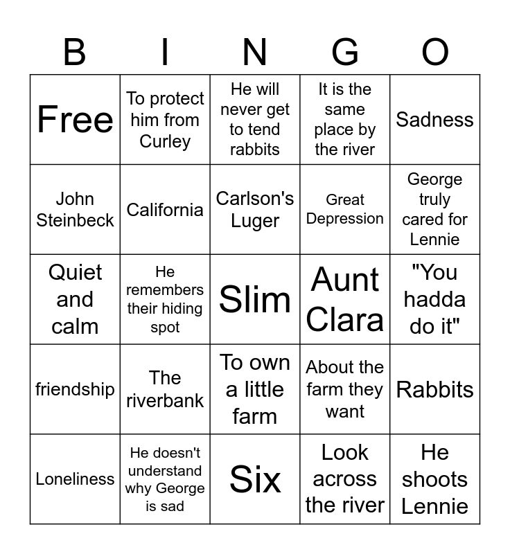 This bingo card has a free space and 24 words: The riverbank, He doesn't understand why George is sad, Carlson's Luger, Loneliness, Sadness, Free, John Steinbeck, To protect him from Curley, Aunt Clara, To own a little farm, Great Depression, Quiet and calm, About the farm they want, Rabbits, California, Look across the river, "You hadda do it", He will never get to tend rabbits, George truly cared for Lennie, He remembers their hiding spot, He shoots Lennie, friendship, It is the same place by the river and Six.