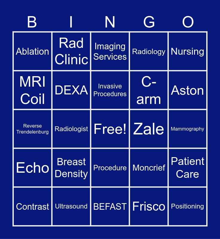 This bingo card has a free space and 70 words: Fluoroscopy, Mammography, CT, MRI, Ultrasound, X-ray, Radiology, Apheresis, Nursing, Technologist, Patient Care, Diagnostic, Ablation, Imaging Services, Adminstration, Radiologist, Procedure, C-arm, UTSW, Echo, Zale, Moncrief, Aston, Richardson, Las Colinas, West Campus, CCOB, CUH, Frisco, Redbird, Rad Clinic, Rogers, Coppell, CVIR, Biopsy, Barium, X-ray Tube, Radiation, Safety, MRI Coil, Nuclear Medicine, Breast Density, Positioning, Power Injector, Fluoroscope, DEXA, Contrast, Joint Commission, Quality Control, Radiation Dose, Patient Prep, PACT, IV Line, Anatomy, BEFAST, PASS, Invasive Procedures, AIDET, Trendelenburg, Cath Lab, Reverse Trendelenburg, Bone Density, Transducer, MRI Safety, Compression, Ejection Fraction, Patient History, Imaging Room, PACS and HIDA.
