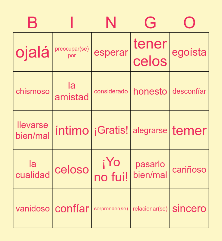 This bingo card has a free space and 38 words: amable, entrometido, comprensivo, la amistad, cariñoso, celoso, considerado, apoyar(se), egoísta, honesto, íntimo, tener celos, sincero, temer, chismoso, la cualidad, la confianza, esperar, el secreto, alegrarse, ojalá, confíar, desconfíar, vanidoso, guardar (un secreto), sorprender(se), aceptar tal como ser, cambiar de opinión, juntos, el chisme, tener en común, ¡Yo no fui!, relacionar(se), preocupar(se) por, pelear(se), pasarlo bien/mal, llevarse bien/mal and contar con.