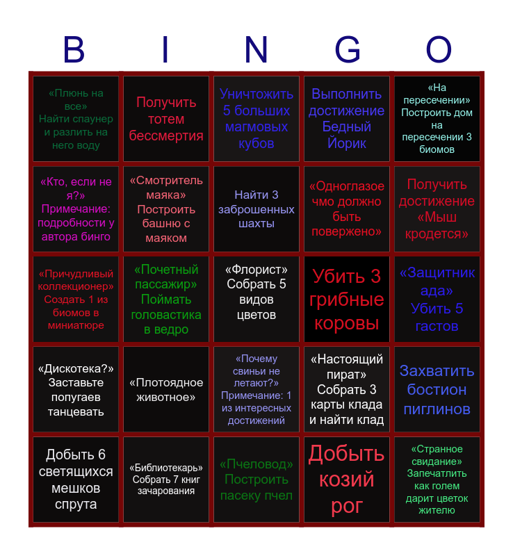 This bingo card has a free space and 24 words: Добыть 6 светящихся мешков спрута, «Плотоядное животное», Найти 3 заброшенных шахты, Добыть козий рог, «На пересечении» Построить дом на пересечении 3 биомов, «Плюнь на все» Найти спаунер и разлить на него воду, Получить тотем бессмертия, Уничтожить 5 больших магмовых кубов, Убить 3 грибные коровы, «Защитник ада» Убить 5 гастов, «Причудливый коллекционер» Создать 1 из биомов в миниатюре, «Смотритель маяка» Построить башню с маяком, «Настоящий пират» Собрать 3 карты клада и найти клад, Захватить бостион пиглинов, «Кто, если не я?» Примечание: подробности у автора бинго, «Библиотекарь» Собрать 7 книг зачарования, «Пчеловод» Построить пасеку пчел, Выполнить достижение Бедный Йорик, Получить достижение «Мыш кродется», «Дискотека?» Заставьте попугаев танцевать, «Почетный пассажир» Поймать головастика в ведро, «Почему свиньи не летают?» Примечание: 1 из интересных достижений, «Одноглазое чмо должно быть повержено» and «Странное свидание» Запечатлить как голем дарит цветок жителю.
