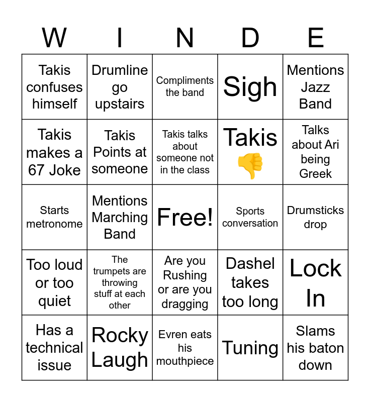 This bingo card has a free space and 49 words: More than 4 people have their phones on their stands, Slams his baton down, Takis makes fun of the piccolo, Evren eats his mouthpiece, The trumpets are throwing stuff at each other, Evren's trumpet disappears, Drumline go upstairs, Takis talks about sports, Takis makes a 67 Joke, Dashel Complaining, Takis Points at someone, Sigh, Lock In, Dashel takes too long, Takis Talks about his kids, Mentions an upcoming performance, Takis talks about someone not in the class, Sports conversation, Takis asks for phones, Mentions Jazz Band, Mentions Marching Band, Tuning, Takis confuses himself, Takis 👎, Asks someone to get something for him, Talks about Ari being Greek, Has a technical issue, Rhythm master time, Are you Rushing or are you dragging, Too loud or too quiet, Doorbell rings, Tells to clean up room, Takis Makes a weird face, One more time, Rocky Laugh, Someone doesn't have their instrument, Missing Music, Takis swears, Drumsticks drop, "Let me know when your ready", Takis making someone uncomfortable, Makes someone play "solo", Takis shows something on his phone, Eating in class, Starts metronome, Compliments the band, Panic Button, Mentions Orchestra and Mentions his old age.