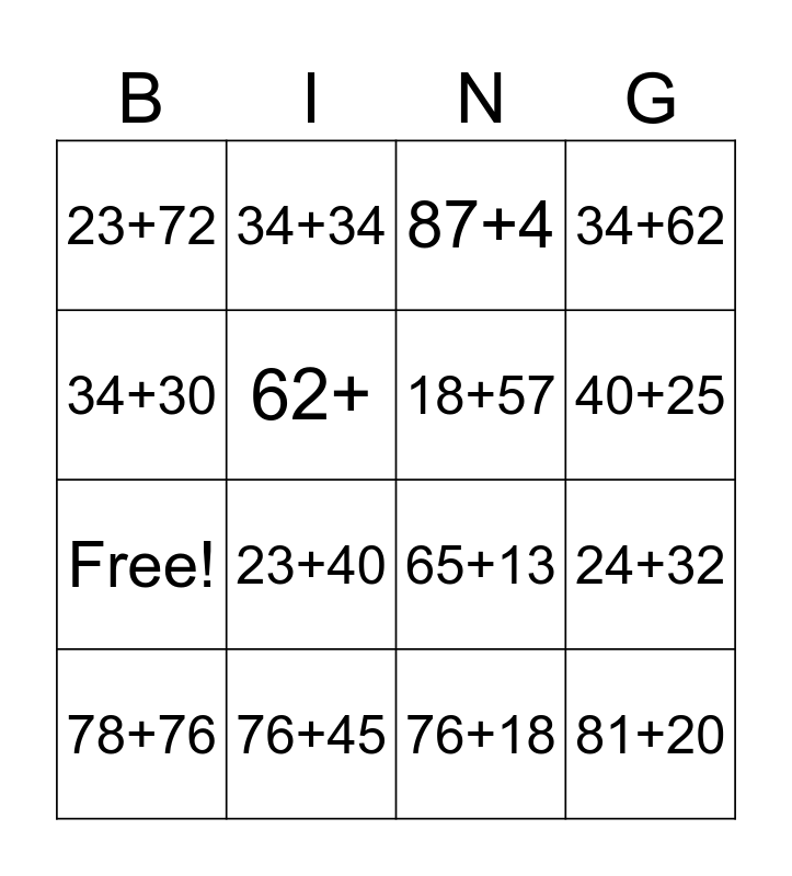 This bingo card has 20 words: 24+32, 34+89, 87+4, 29+12, 78+76, 34+30, 76+45, 23+72, Free!, 34+34, 23+40, 65+13, 62+, 81+20, 18+57, 56+29, 40+25, 34+62, 76+18 and 68+50.