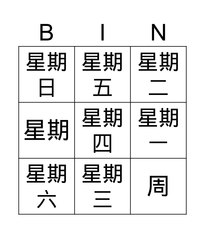 This bingo card has a free space and 8 words: 星期一, 星期二, 星期五, 星期六, 星期日, 周, 星期 and 星期三.