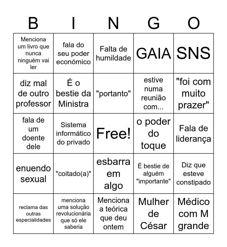 This bingo card has a free space and 31 words: Menciona a teórica que deu ontem, Professor reformado/ falecido, Sistema informático do privado, POLÍTICA, Menciona um livro que nunca ninguém vai ler, Falta de humildade, É o bestie da Ministra, É bestie de alguém "importante", o poder do toque, Mulher de César, Fala de liderança, Médico com M grande, não vejo problema absolutamente nenhum, "assim", "foi com muito prazer", Dinheiro, Diz que esteve constipado, "coitado(a)", enuendo sexual, esbarra em algo, SNS, reclama dos informáticos, reclama das outras especialidades, fala do seu poder económico, estive numa reunião com..., diz mal de outro professor, GAIA, fala de um doente dele, menciona uma solução revolucionária que só ele saberia, "portanto" and fala dos múltiplos artigos que escreveu.
