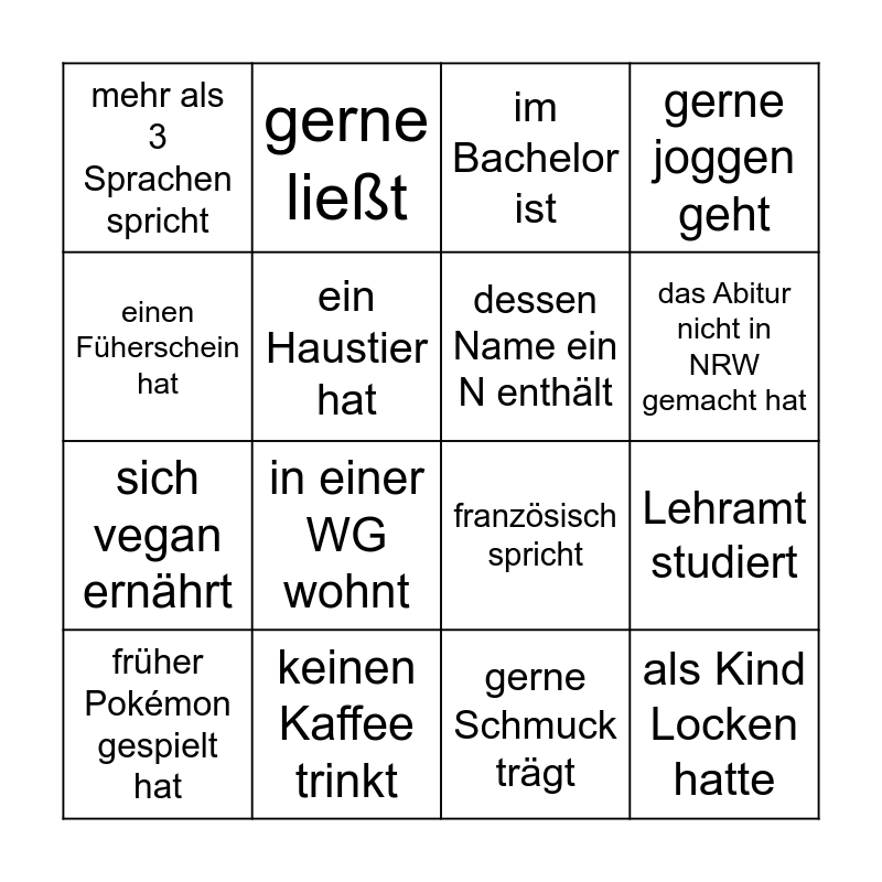 This bingo card has 28 words: Free!, einen Bruder hat, sich vegan ernährt, schonmal auf einem anderen Kontinent war, ein Haustier hat, im Bachelor ist, gerne ließt, als Kind Locken hatte, keinen Kaffee trinkt, im Juni Geburtstag hat, französisch spricht, gerne joggen geht, neben dem Studium arbeitet, dessen Eltern keine Akademiker sind (nicht studiert haben), in einer WG wohnt, Blumen mag, gerne telefoniert, dessen Name ein N enthält, das Abitur nicht in NRW gemacht hat, sich ehrenamtlich engagiert, mehr als 3 Sprachen spricht, mit dem Fahrrad zur Uni fährt, früher Pokémon gespielt hat, Lehramt studiert, gerne Schmuck trägt, schonmal Ski fahren war, einen Füherschein hat and keine Schokolade mag.