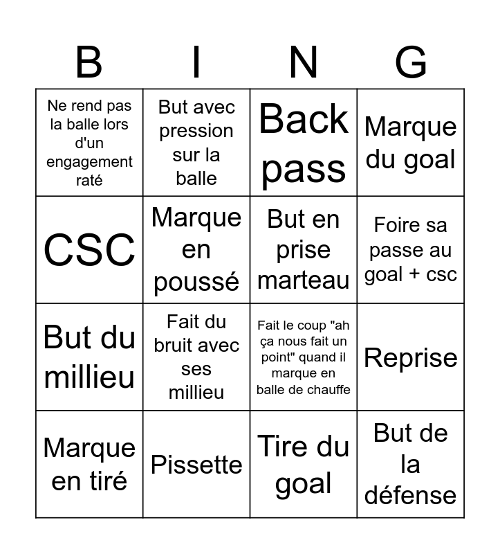 This bingo card has 16 words: Pissette, Reprise, Back pass, Ne rend pas la balle lors d'un engagement raté, But du millieu, But avec pression sur la balle, Fait le coup "ah ça nous fait un point" quand il marque en balle de chauffe, Tire du goal, CSC, Marque en poussé, Marque en tiré, Marque du goal, Fait du bruit avec ses millieu, Foire sa passe au goal + csc, But en prise marteau and But de la défense.