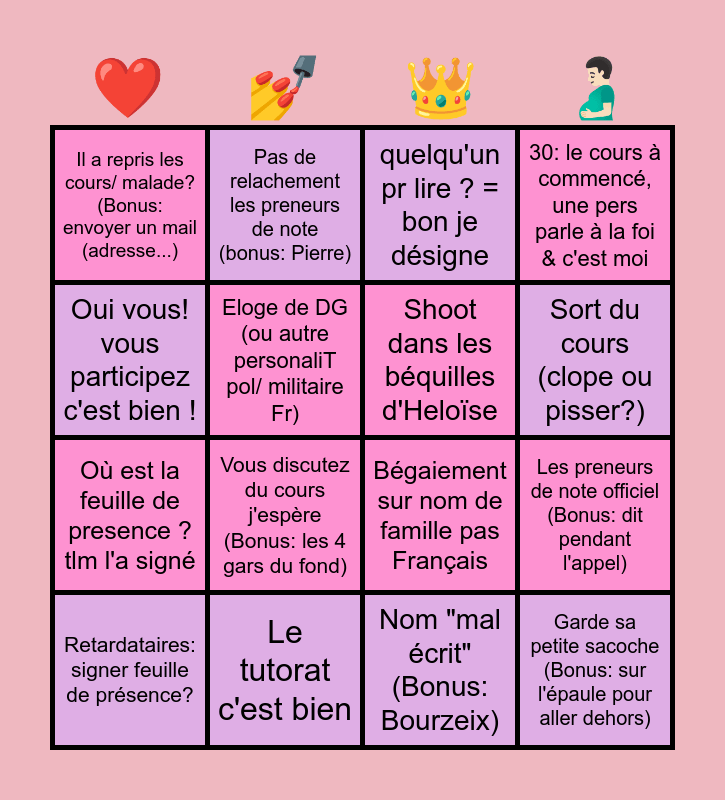 This bingo card has 16 words: Le tutorat c'est bien, Les preneurs de note officiel (Bonus: dit pendant l'appel), quelqu'un pr lire ? = bon je désigne, Il a repris les cours/ malade? (Bonus: envoyer un mail (adresse...), Où est la feuille de presence ? tlm l'a signé, Pas de relachement les preneurs de note (bonus: Pierre), Bégaiement sur nom de famille pas Français, Nom "mal écrit" (Bonus: Bourzeix), Oui vous! vous participez c'est bien !, Eloge de DG (ou autre personaliT pol/ militaire Fr), Retardataires: signer feuille de présence?, 30: le cours à commencé, une pers parle à la foi & c'est moi, Vous discutez du cours j'espère (Bonus: les 4 gars du fond), Sort du cours (clope ou pisser?), Shoot dans les béquilles d'Heloïse and Garde sa petite sacoche (Bonus: sur l'épaule pour aller dehors).