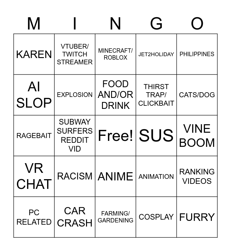 This bingo card has a free space and 24 words: RACISM, CAR CRASH, FOOD AND/OR DRINK, PC RELATED, PHILIPPINES, KAREN, AI SLOP, VTUBER/ TWITCH STREAMER, SUS, ANIME, THIRST TRAP/ CLICKBAIT, RAGEBAIT, ANIMATION, RANKING VIDEOS, EXPLOSION, COSPLAY, VINE BOOM, MINECRAFT/ ROBLOX, CATS/DOG, SUBWAY SURFERS REDDIT VID, FURRY, VR CHAT, JET2HOLIDAY and FARMING/ GARDENING.