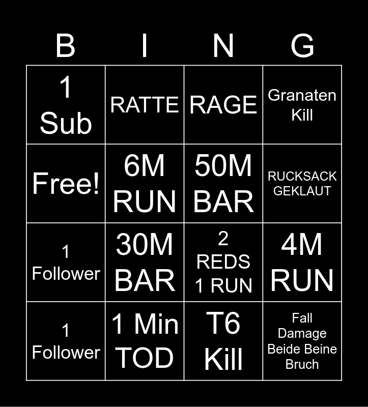 This bingo card has 16 words: 1 Min TOD, 4M RUN, RAGE, 1 Sub, 1 Follower, RATTE, 2 REDS 1 RUN, T6 Kill, Free!, 6M RUN, 1 Follower, Granaten Kill, 30M BAR, RUCKSACK GEKLAUT, 50M BAR and Fall Damage Beide Beine Bruch.