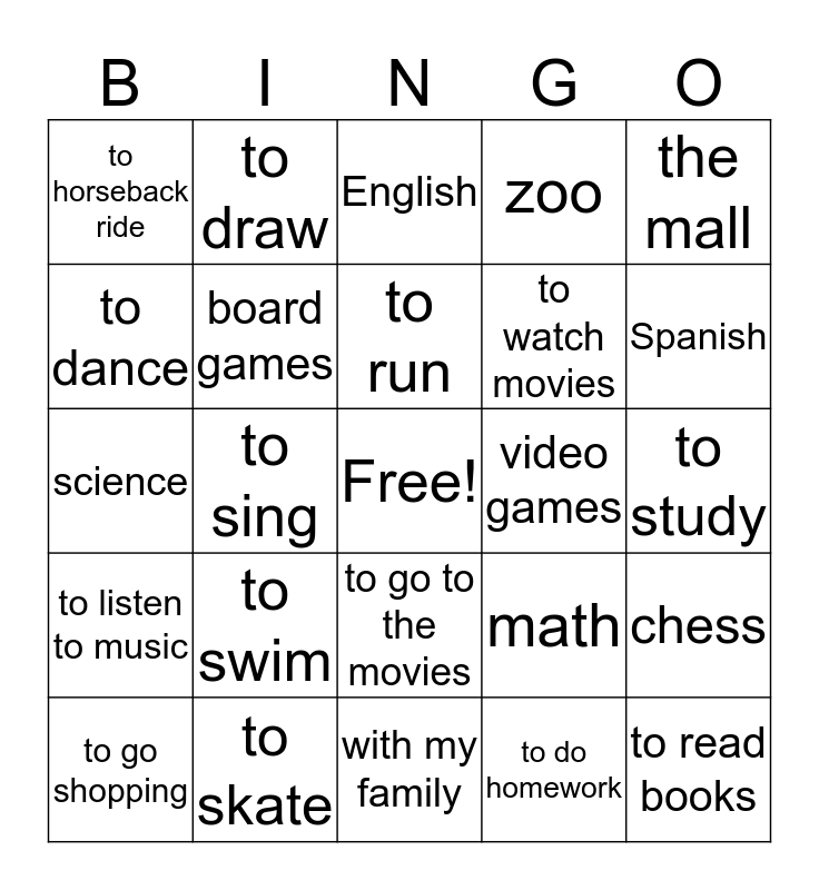 This bingo card has a free space and 24 words: to swim, to skate, to run, to go shopping, the mall, to horseback ride, to dance, to draw, video games, to go to the movies, to watch movies, science, math, chess, board games, to do homework, to study, English, Spanish, to sing, to read books, to listen to music, zoo and with my family.