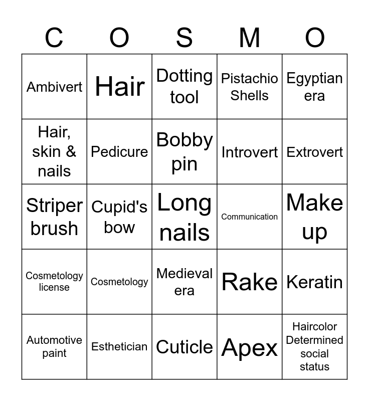 This bingo card has a free space and 24 words: Cosmetology, Esthetician, Bobby pin, Automotive paint, Egyptian era, Ambivert, Hair, skin & nails, Hair, Communication, Medieval era, Introvert, Striper brush, Rake, Keratin, Pedicure, Apex, Make up, Dotting tool, Extrovert, Cupid's bow, Haircolor Determined social status, Cosmetology license, Pistachio Shells and Cuticle.
